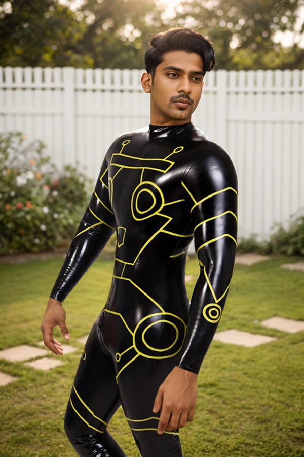 Step into the future with the "Robotico" Back Zipper Latex Catsuit. This stunning piece is crafted from high-gloss natural latex, boasting a powerful combination of classic black and vibrant yellow. The material's brilliant, reflective quality highlights the suit's sleek design and sculpted contours, creating a look that is both futuristic and commanding.